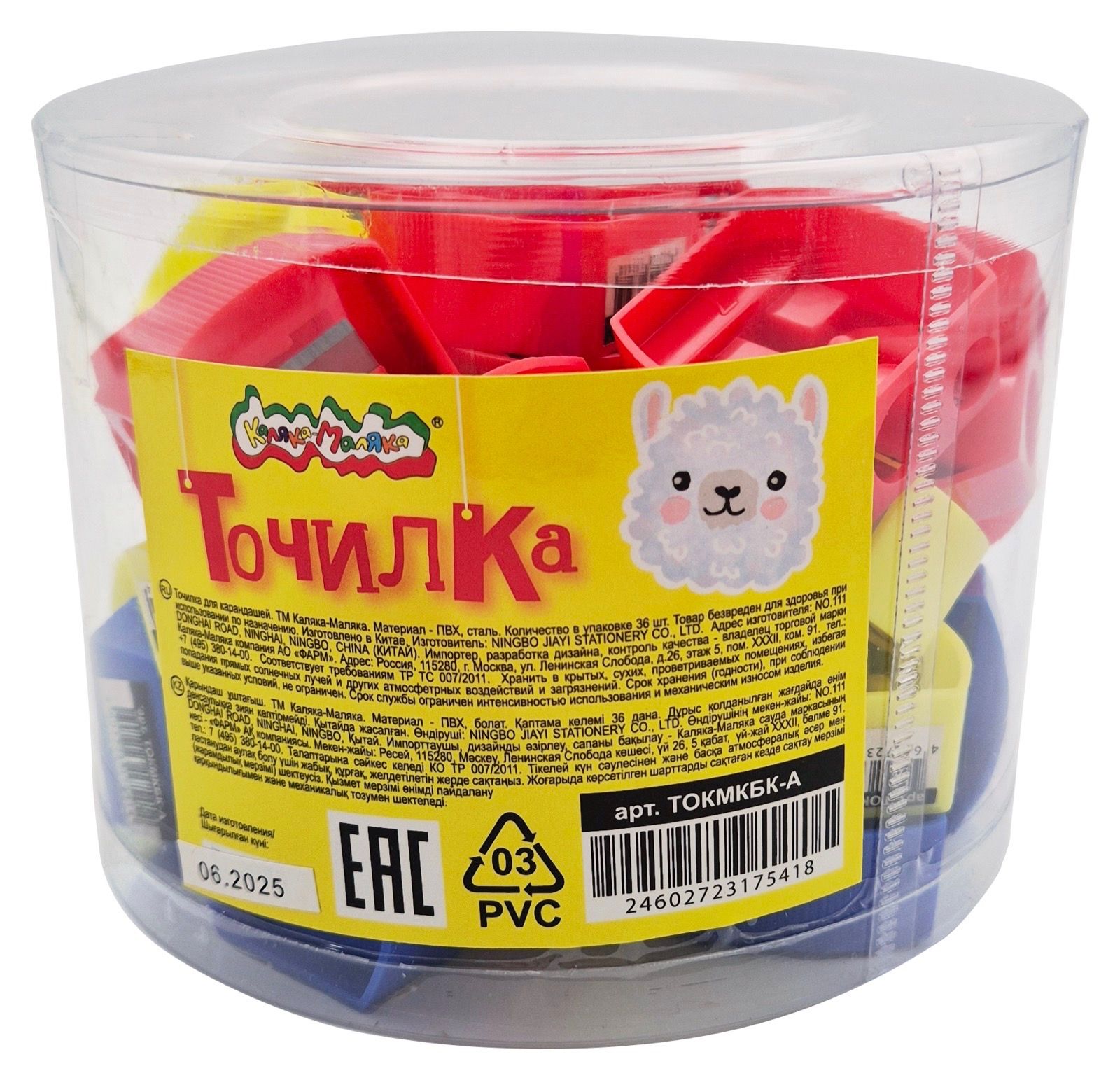 Цвет: ассорти Упаковка: тубус Наличие индивидуального штрих-кода: Да Форма: квадратная Количество отверстий для заточки: 2 отверстия Торговая марка: Каляка-Маляка Мин. партия и варианты упаковок: 1 / 36 / 1440 Точилка Каляка-Маляка ассорти, корпус пластик, 2 отверстия, тубус