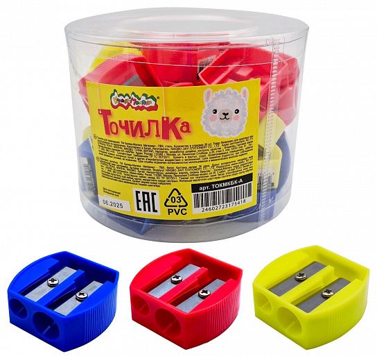 Цвет: ассорти Упаковка: дисплей Комплектация: с контейнером Наличие индивидуального штрих-кода: Да Форма: фигурная Количество отверстий для заточки: 1 отверстие Мин. партия и варианты упаковок: 1 / 24 / 720 -