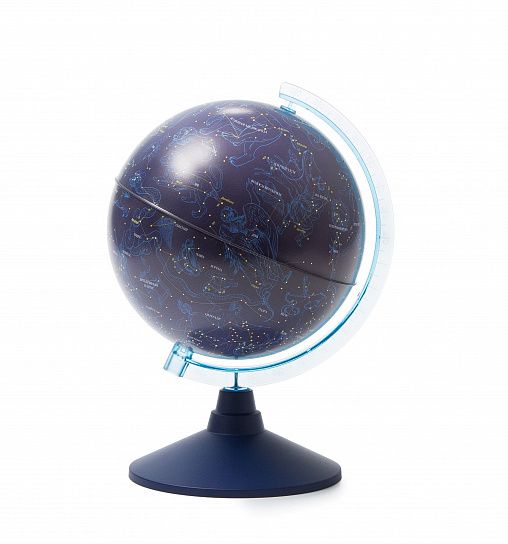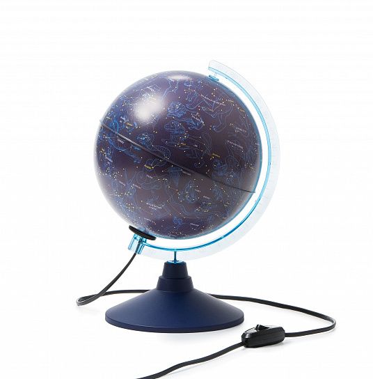 Глобус звездного неба - это фантастика для тех, кто любит астрономию. Сфера изготовлена из пластика. Диаметр сферы 32 см. Устойчивая настольная подставка из пластика синего цвета. Карта максимально подробная для данного диаметра глобуса. Линия экватора выпуклая для тактильно восприятия. Карта физическая. Изображение карты - звездное небо. Лампа подсветки съемная, цоколь Е14.
